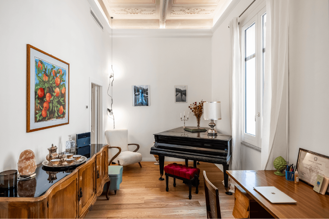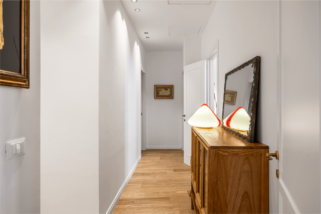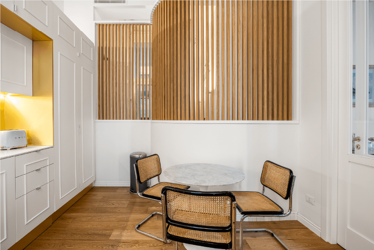 Elementi classici come le cornici a soffitto dialogano con dettagli contemporanei, come le porte scorrevoli e le lamelle verticali in legno che scandiscono il passaggio tra gli ambienti. Ogni scelta progettuale riflette un equilibrio tra memoria e modernità, tra rigore funzionale e sensibilità estetica.