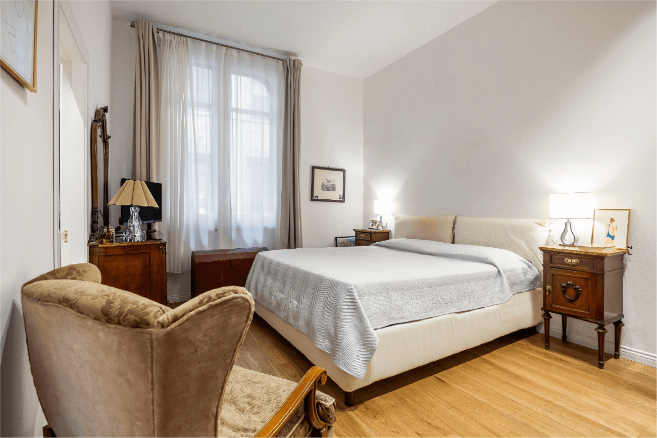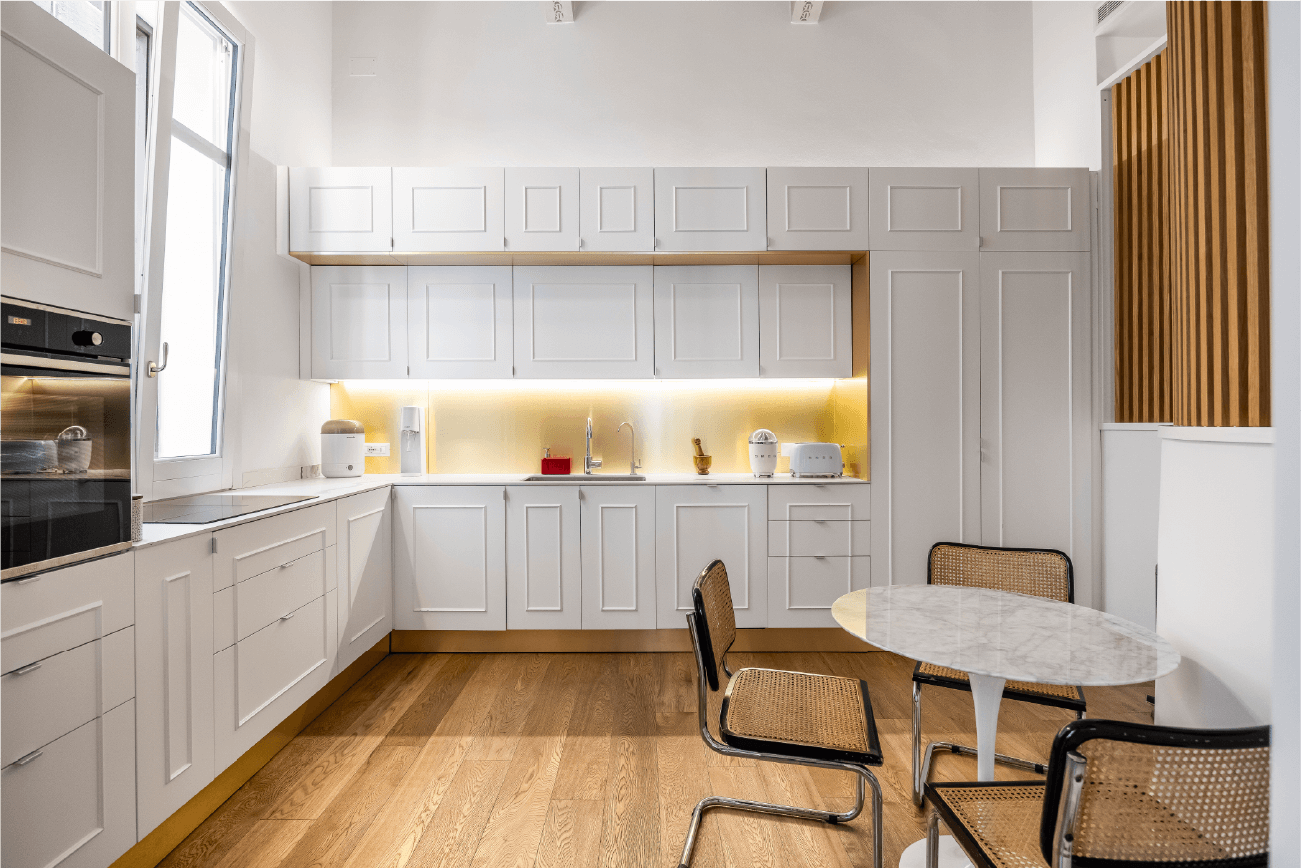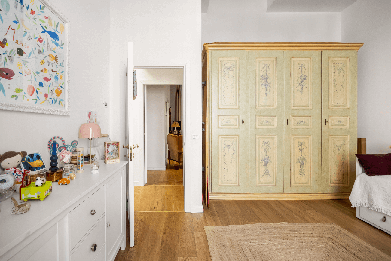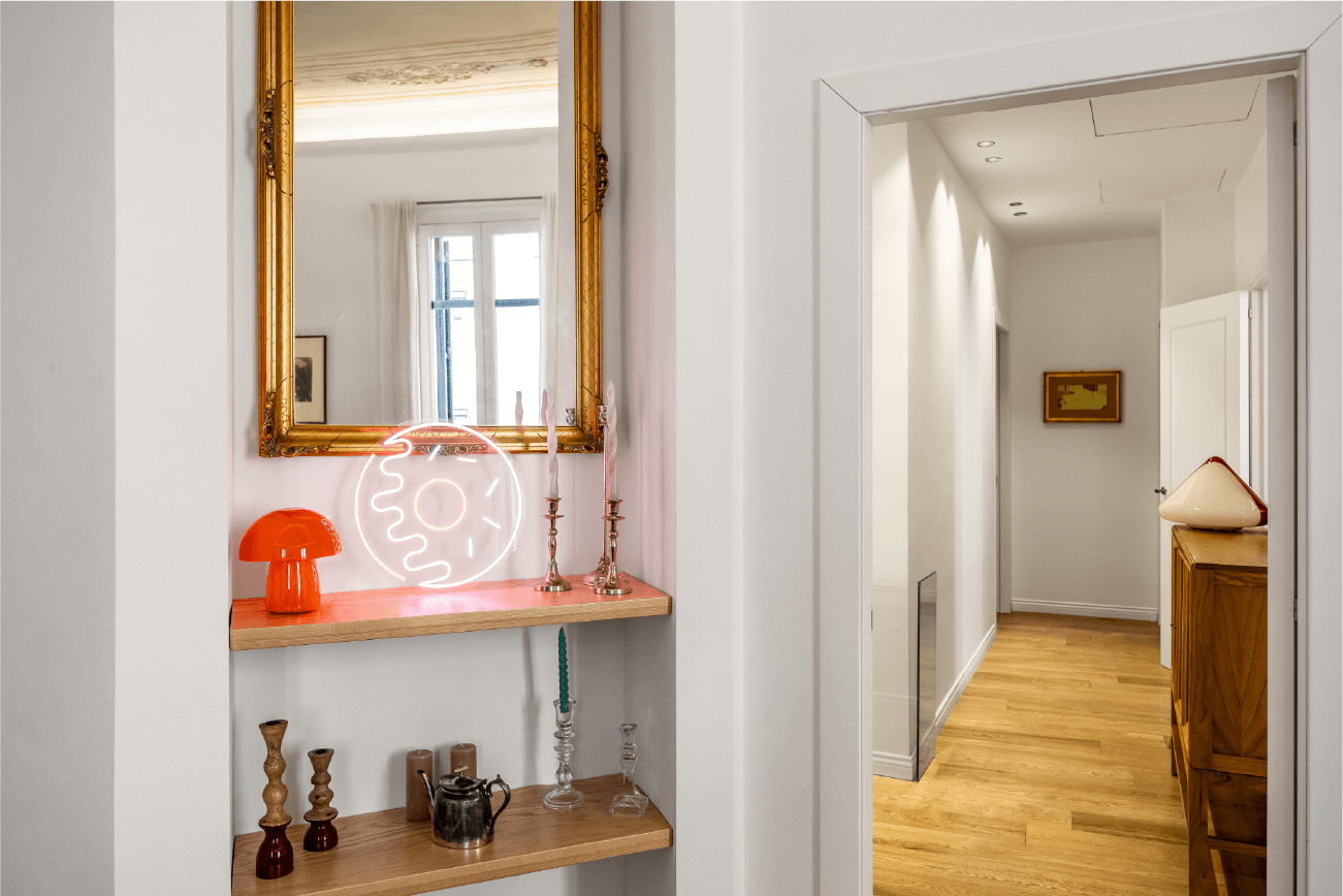 Elementi classici come le cornici a soffitto dialogano con dettagli contemporanei, come le porte scorrevoli e le lamelle verticali in legno che scandiscono il passaggio tra gli ambienti. Ogni scelta progettuale riflette un equilibrio tra memoria e modernità, tra rigore funzionale e sensibilità estetica.