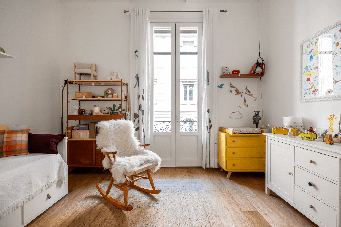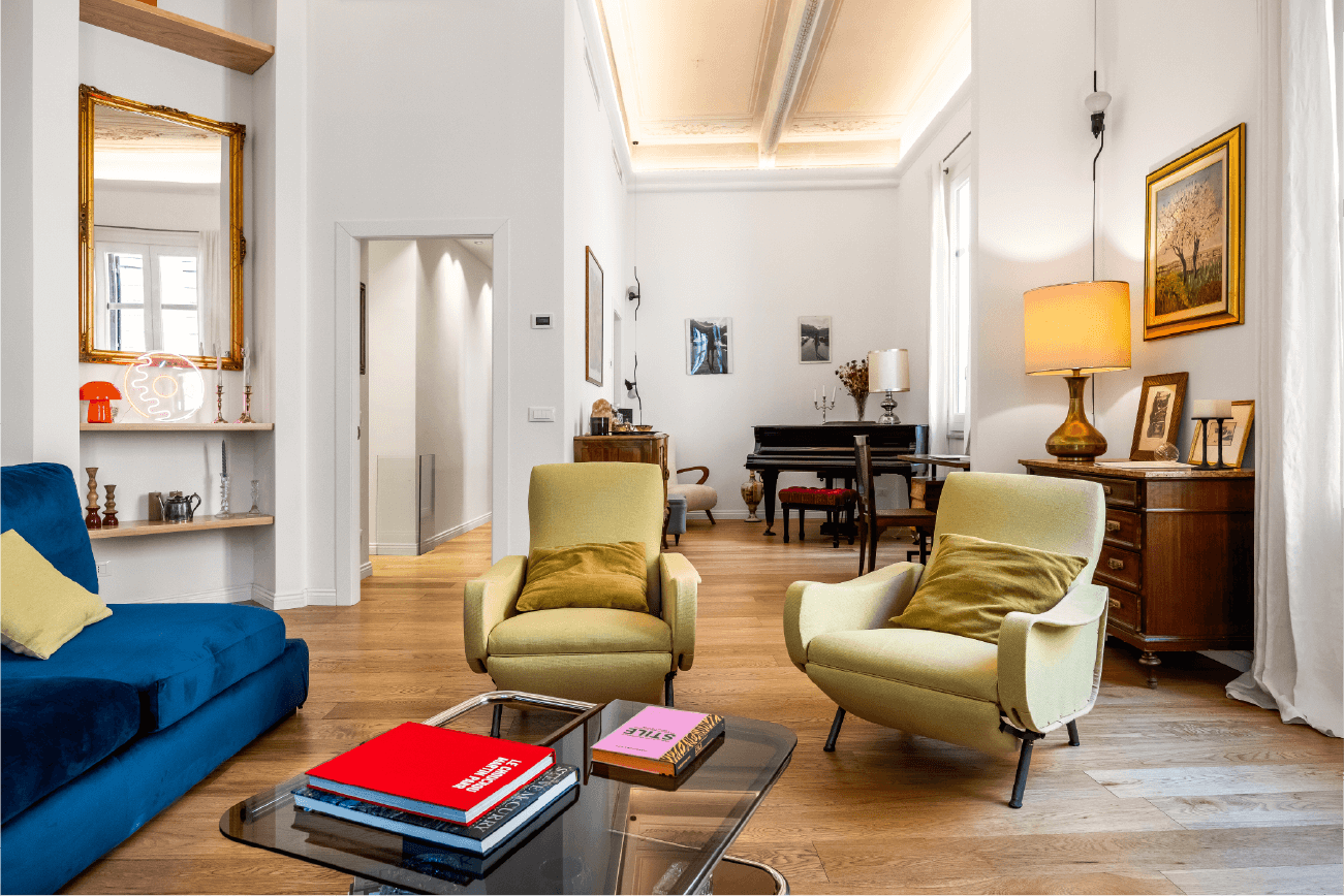 Il progetto ha ridisegnato completamente la distribuzione degli spazi, valorizzando la luce naturale e i volumi esistenti. Il soggiorno e la zona pranzo si fondono in un ambiente fluido, dove il parquet in legno caldo incontra arredi su misura dai toni vivaci.