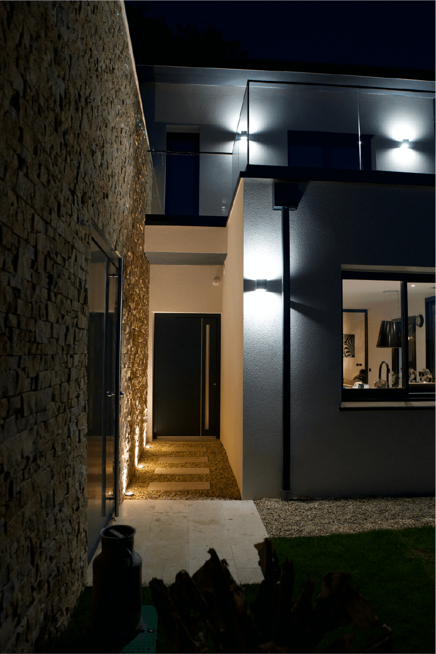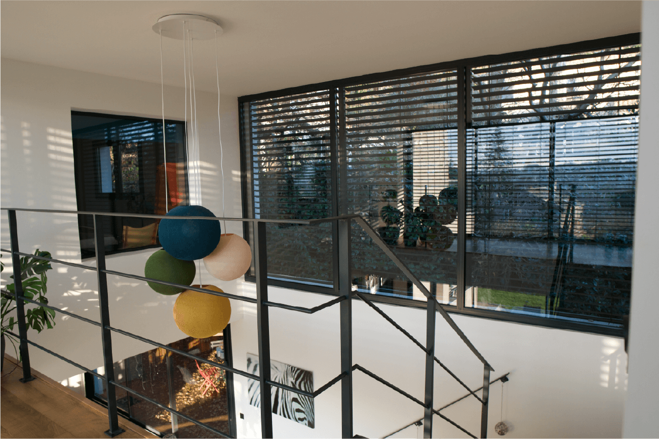 L’abitazione si sviluppa su due livelli, con grandi vetrate che mettono in relazione l’interno con il verde esterno. Gli spazi interni sono ampi e ben distribuiti: il soggiorno e la zona pranzo si fondono in un ambiente unico, caratterizzato da arredi essenziali, materiali naturali e una forte presenza della luce.