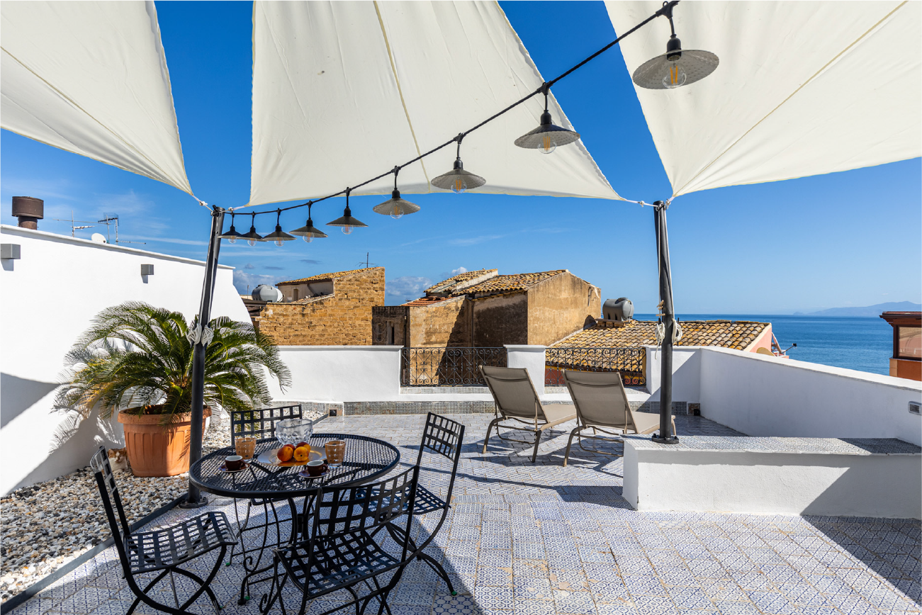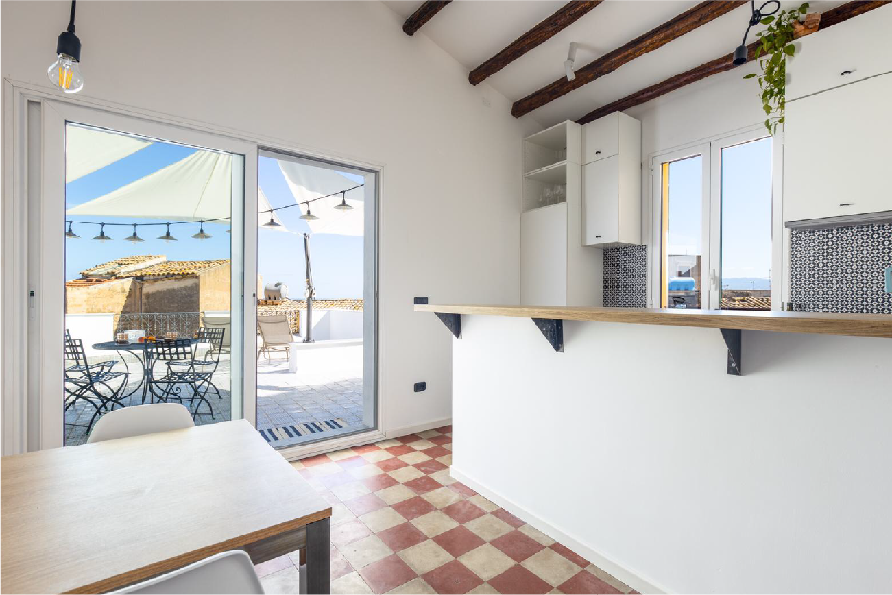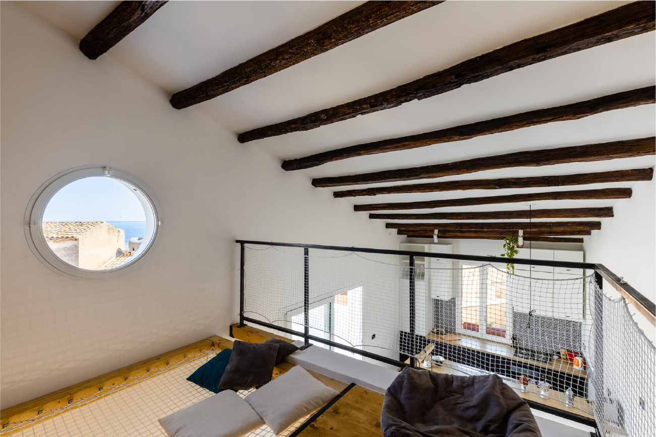 La parte superiore della casa è quella che ha subito il più grande miglioramento, aprendosi sulla terrazza con una vista a mozzafiato sul mare e aumentando il suo volume sfruttando la parte superiore del vanno scala per creare uno spazio riposo.